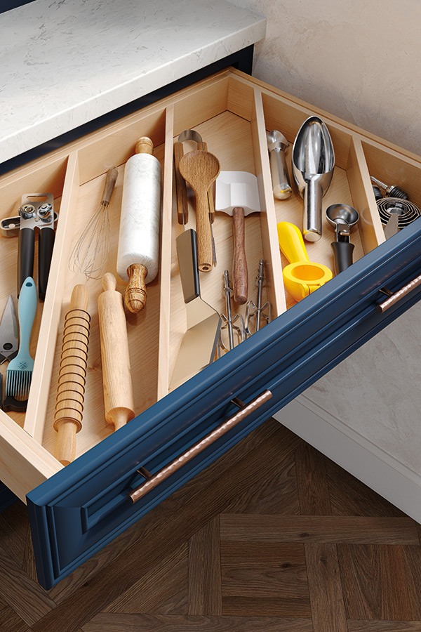 Make a wider drawer work smarter for you by including a Cooking Utensil divider that keeps larger serving and cooking utensils organized and at your fingertips.