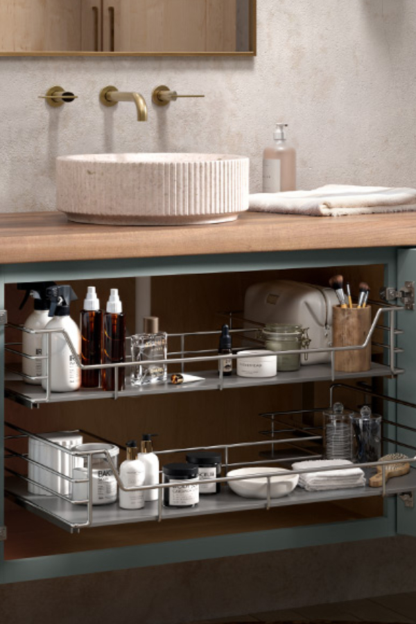 Our U-Shaped Pullout cabinet optimizes every inch as it surrounds the plumbing while bringing items right to your fingertips.