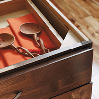 - Drawer backs and fronts are 5/8" nominal thick solid material with dovetailed corner construction.