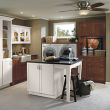 To create functional use areas, homeowners are grouping cabinets together in innovative ways. Imagine a fervent baker who creates a baking center in the kitchen that includes not only a counter work surface, but storage cabinets for cookbooks, baking pans and pantry items as well. Or for the laundry room, a homeowner may include an ironing area with a utility cabinet with room for the iron, ironing board and storage for laundry or cleaning supplies.