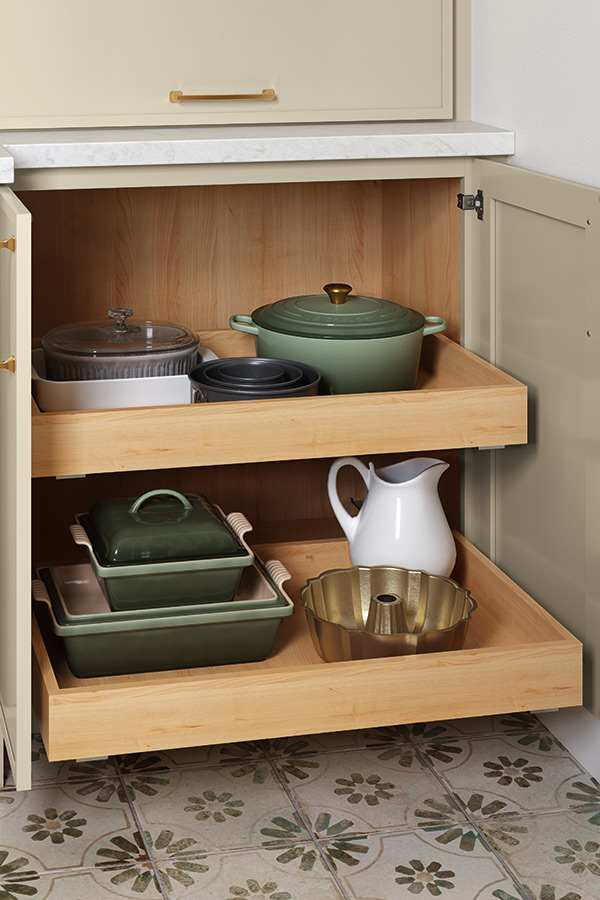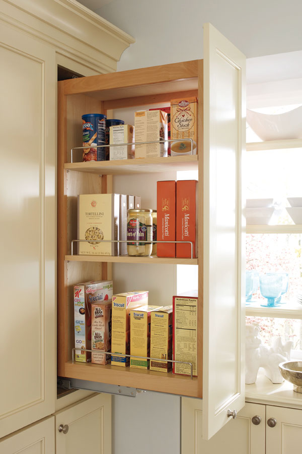 The flexibility to specify any base cabinet enables you to create custom configurations to accommodate this 24" deep wall pantry unit, which is available in a broader range of widths and heights. Shown outfitted with our optional Deep Roll Tray Modification.
