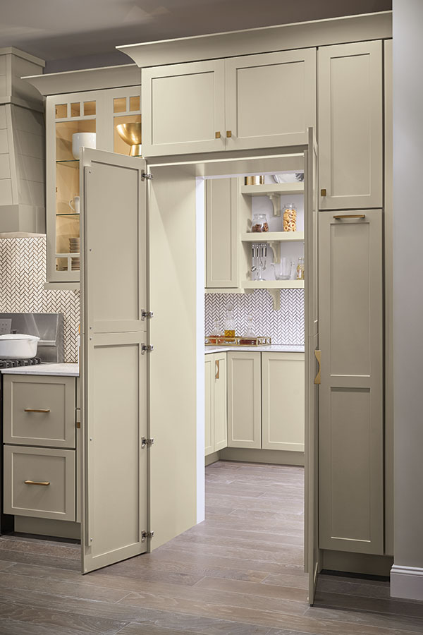 The Pantry Walk Through Cabinet features full-height doors without a cabinet back or bottom. So rather than having regular pantry doors disrupt design continuity, tall cabinet doors disguise the doorway and serve as a cohesive element providing the illusion of a larger kitchen.