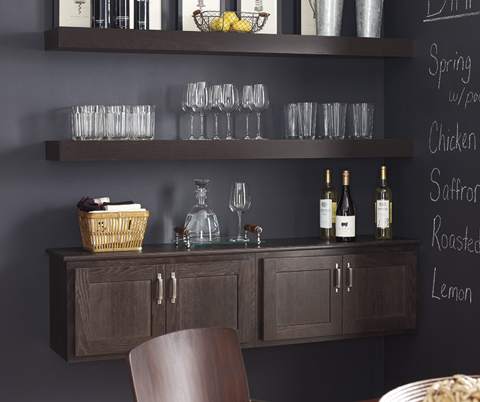 Think outside the box! Floating shelves and wall cabinets hung low create the perfect small bar space.